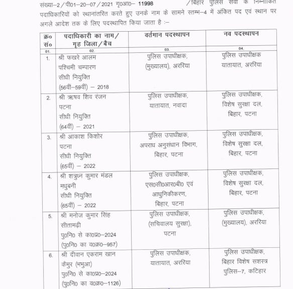 मनोज कुमार सिंह जो अब तक सचिवालय सुरक्षा पटना के डीएसपी थे उन्हें अब अररिया (मुख्यालय) का डीएसपी बनाया गया है। दीवान इकराम खान, अररिया में ट्रैफिक डीएसपी के रूप में कार्यरत थे अब विशेष सशस्त्र पुलिस-7 कटिहार के डीएसपी होंगे। राजेश रंजन बिहार विशेष सशस्त्र पुलिस-1 में तैनात थे अब सचिवालय सुरक्षा पटना में पुलिस उपाधीक्षक के रूप में योगदान देंगे।