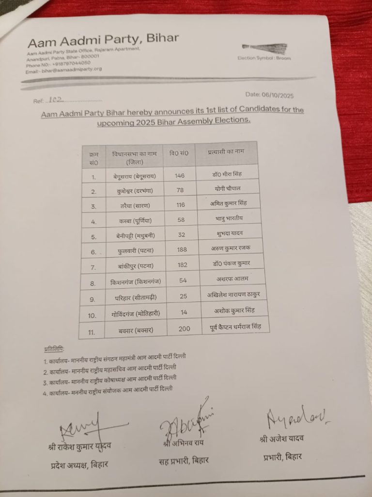 पटना। बिहार विधानसभा चुनाव की सरगर्मी तेज होते ही आम आदमी पार्टी (AAP) ने बड़ा कदम उठाते हुए अपने उम्मीदवारों की पहली सूची जारी कर दी है। प्रदेश अध्यक्ष राकेश यादव और बिहार प्रभारी अजेश यादव ने सोमवार को पटना के एक होटल में प्रेस कॉन्फ्रेंस कर यह लिस्ट सार्वजनिक की। आम आदमी पार्टी ने साफ किया है कि वह बिहार की सभी 243 सीटों पर अकेले चुनावी मैदान में उतरेगी। पार्टी नेताओं ने कहा कि अरविंद केजरीवाल का दिल्ली-पंजाब मॉडल अब बिहार में भी आजमाया जाएगा। बेरोजगारी पलायन और महंगाई जैसे मुद्दों पर जनता को जोड़ने की रणनीति बनाई जा रही है।