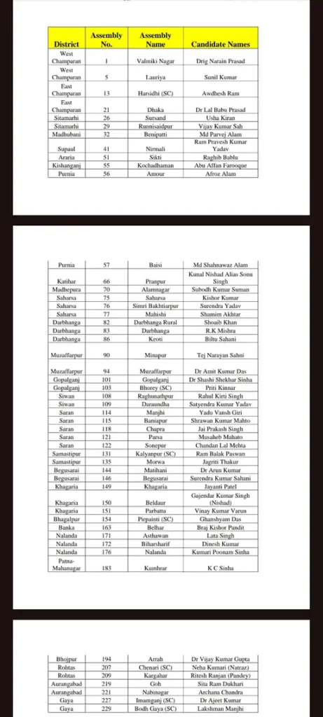दरभंगा से आरके मिश्रा, गोपालगंज से प्रीति किन्नर, कुम्हरार से केसी सिन्हा, मांझी से वाई बी गिरी को टिकट दिया है. करगहर से भोजपुरी सिंगर रितेश पांडेय, अस्थावां से RCP सिंह की बेटी लता सिंह को जन सुराज ने चुनावी मैदान में उतारा है.