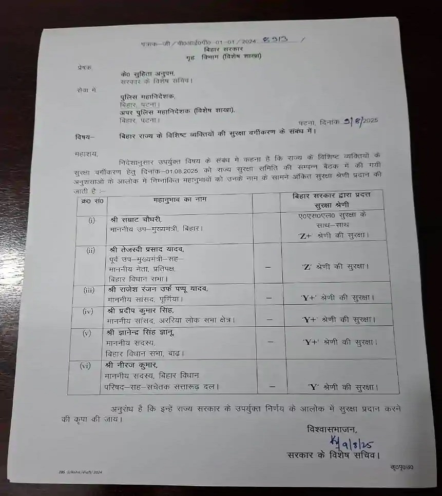 गृह विभाग द्वारा जारी अधिसूचना के मुताबिक, डिप्टी सीएम सम्राट चौधरी को Z+ श्रेणी, नेता प्रतिपक्ष तेजस्वी यादव को Z श्रेणी, पूर्णिया सांसद पप्पू यादव और अररिया सांसद प्रदीप कुमार सिंह को Y+ श्रेणी, बाढ़ से विधायक ज्ञानेन्द्र सिंह ज्ञानू को Y+ और जदयू एमएलसी नीरज कुमार को Y श्रेणी की सुरक्षा दी गई है।