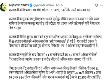 ​तेजस्वी ने आंकड़ों का हवाला देते हुए बताया कि अब तक 11 लाख से अधिक केस दर्ज हुए हैं और 16 लाख लोग गिरफ्तार किए जा चुके हैं। उन्होंने सवाल उठाया कि जब 5 करोड़ लीटर से ज्यादा शराब जब्त की गई है, तो आखिर यह शराब राज्य में आ कैसे रही है? उन्होंने आरोप लगाया कि सरकार छोटे कर्मचारियों पर तो गाज गिराती है, लेकिन बड़े अधिकारियों और असली सिंडिकेट पर कार्रवाई करने से बच रही है।