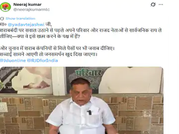 ​तेजस्वी यादव के आरोपों का जवाब देते हुए नीरज कुमार ने कहा कि तेजस्वी केवल सवाल खड़ा करना जानते हैं, समाधान देना नहीं। उन्होंने सीधे हमला बोलते हुए कहा कि तेजस्वी यादव अपनी मां (राबड़ी देवी), पत्नी और बहन से लिखित हस्ताक्षर करवाकर यह सार्वजनिक करें कि वे शराबबंदी को गलत मानती हैं। नीरज कुमार के अनुसार, विपक्ष को इस सामाजिक मुद्दे पर अपना स्टैंड साफ करना चाहिए, न कि केवल हवा में बातें करनी चाहिए।