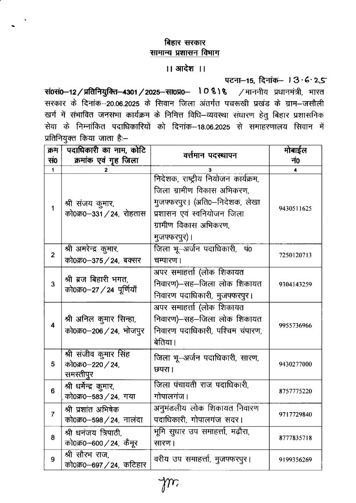 प्रधानमंत्री नरेंद्र मोदी के दौरे से पहले नीतीश सरकार ने बिहार प्रशासनिक सेवा के 25 अधिकारियों को 2 दिन पहले यानी 18 जून से ही सीवान समाहरणालय में तैनात कर दिया है. ये अधिकारी पीएम मोदी के कार्यक्रम की देखरेख में तैनात रहेंगे. सभी अधिकारियों को 18 जून से सीवान में मौजूद रहने का आदेश दिया गया है.