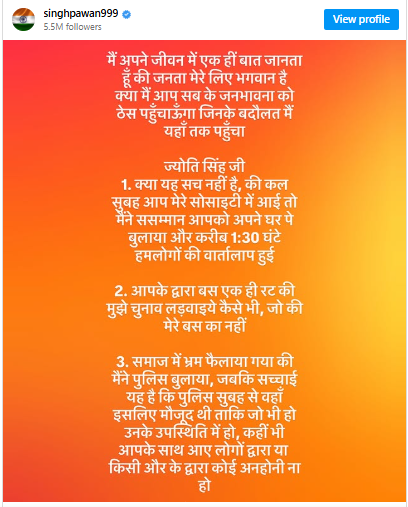 पवन सिंह ने पत्नी ज्योति से उन्होंने सवाल करते हुए लिखा कि ”ज्योति सिंह जी क्या यह सच नहीं है कि कल सुबह आप मेरी सोसाइटी में आईं तो मैंने ससम्मान आपको अपने घर पे बुलाया और करीब 1:30 घंटे हम लोगों की वार्तालाप हुई? आपके द्वारा बस एक ही रट कि मुझे चुनाव लड़वाइए कैसे भी, जो मेरे वश का नहीं.”