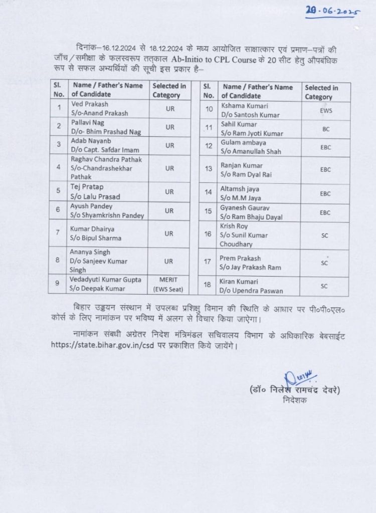 मिली जानकारी के अनुसार बिहार सरकार के उड्डयन प्रशिक्षण निदेशालय ने तेज प्रताप यादव को सफल घोषित किया है। तेज प्रताप यादव ने सन 2023- 24 में सीपीएल कोर्स में एडमिशन के लिए इंटरव्यू दिया था। अब निदेशालय ने सफल उम्मीदवारों की सूची को जारी किया है। इस सूची में तेज प्रताप यादव का भी नाम शामिल है। सूची में तेज प्रताप यादव पांचवें स्थान पर हैं। उनका चयन सामान्य श्रेणी के तहत किया गया है। सीपीएल कोर्स के लिए 18 अभ्यर्थियों को सफल घोषित किया गया है। जबकि इसमें 20 सीटें होती हैं। इन्हीं अभ्यर्थियों में तेज प्रताप यादव भी शामिल है।