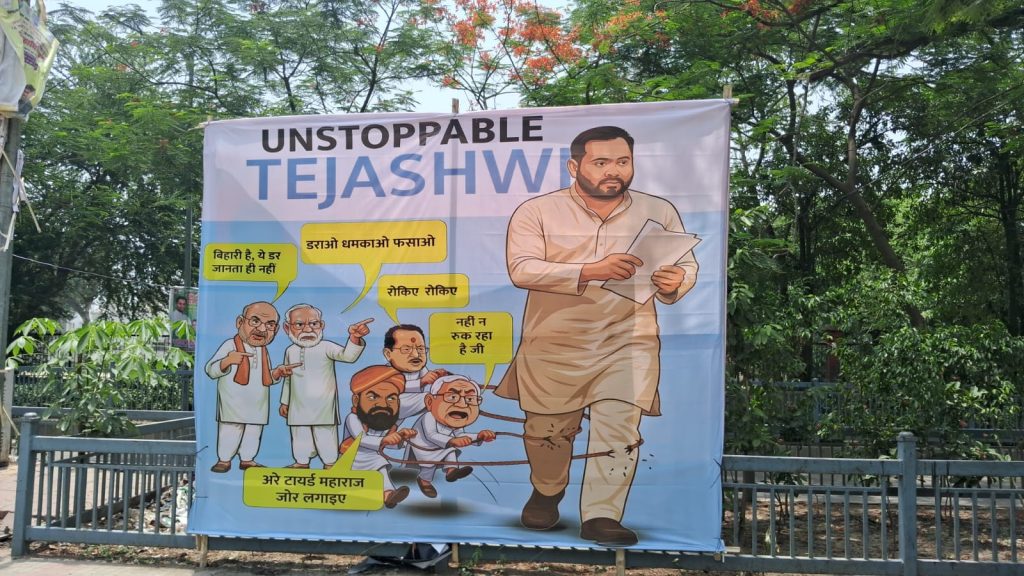 पोस्टर में दिखाया गया है कि मुख्यमंत्री नीतीश कुमार, उपमुख्यमंत्री सम्राट चौधरी और उपमुख्यमंत्री विजय सिन्हा तेजस्वी के पांव में रस्सी लगाकर बांध रहा है, लेकिन तेजस्वी रस्सी तोड़ आगे बढ़ रहे हैं. ऐसे में मुख्यमंत्री नीतीश कुमार कह रहे हैं कि ”नहीं रुक रहा है ना जी.”