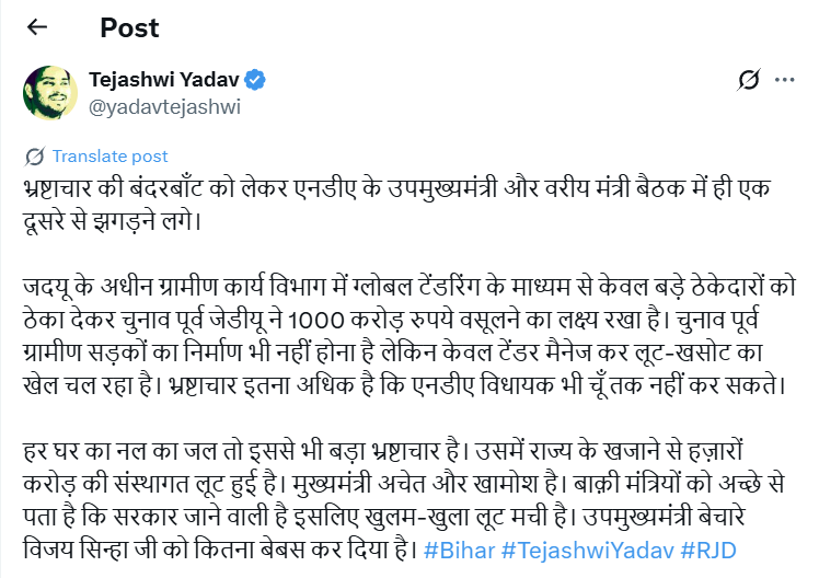 तेजस्वी यादव ने कहा- ”भ्रष्टाचार की बंदरबाँट को लेकर एनडीए के उपमुख्यमंत्री और वरीय मंत्री बैठक में ही एक दूसरे से झगड़ने लगे. जदयू के अधीन ग्रामीण कार्य विभाग में ग्लोबल टेंडरिंग के माध्यम से केवल बड़े ठेकेदारों को ठेका देकर चुनाव पूर्व जेडीयू ने 1000 करोड़ रुपये वसूलने का लक्ष्य रखा है.”