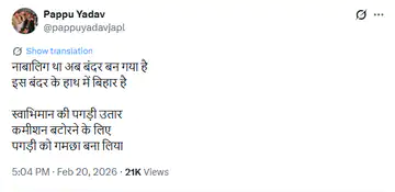 सम्राट चौधरी के इस बयान पर पप्पू यादव ने सोशल मीडिया प्लेटफॉर्म ‘X’ पर कड़ा पलटवार किया। उन्होंने आपत्तिजनक लहजे में लिखा कि जो पहले ‘नाबालिग’ था, वह अब ‘बंदर’ बन गया है और बिहार की कमान इसी बंदर के हाथ में है। यादव ने उनकी पगड़ी पर भी कटाक्ष करते हुए इसे स्वाभिमान के बजाय कमीशन का प्रतीक बताया।