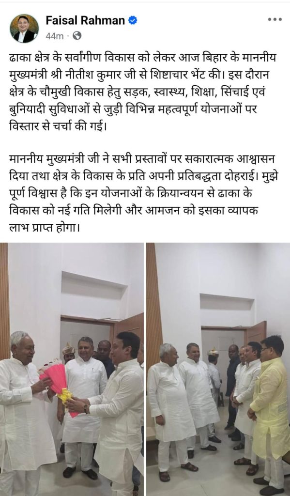 कुंदन कुमार/ पटना। बिहार की राजनीति में एक बार फिर बड़े उलटफेर की सुगराहट तेज हो गई है। राज्यसभा चुनाव के दौरान वोटिंग से दूरी बनाने वाले आरजेडी विधायक फैजल रहमान ने मुख्यमंत्री नीतीश कुमार से उनके सरकारी आवास 1 अणे मार्ग पर मुलाकात की है। इस मुलाकात के बाद राज्य के सियासी गलियारों में कयासों का दौर शुरू हो गया है कि क्या बिहार में कोई नया समीकरण आकार ले रहा है।