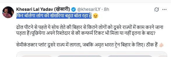 केंद्र सरकार की इस घोषणा पर भोजपुरी सुपरस्टार खेसारी लाल यादव ने सोशल मीडिया पर तीखी प्रतिक्रिया दी। उन्होंने कहा कि “ढोल पीटने से पहले सरकार को यह सोचना चाहिए कि बिहार के कितने लोग रोज़गार के लिए दूसरे राज्यों में पलायन कर रहे हैं। उन्होंने सवाल उठाया कि जब टिकट ही कन्फर्म नहीं मिलता तो इतनी ट्रेनों का फायदा किसे मिलेगा? खेसारी ने यह भी तंज कसा कि सेमीकंडक्टर प्लांट बिहार के बजाय दूसरे राज्यों में क्यों लगाए जा रहे हैं?