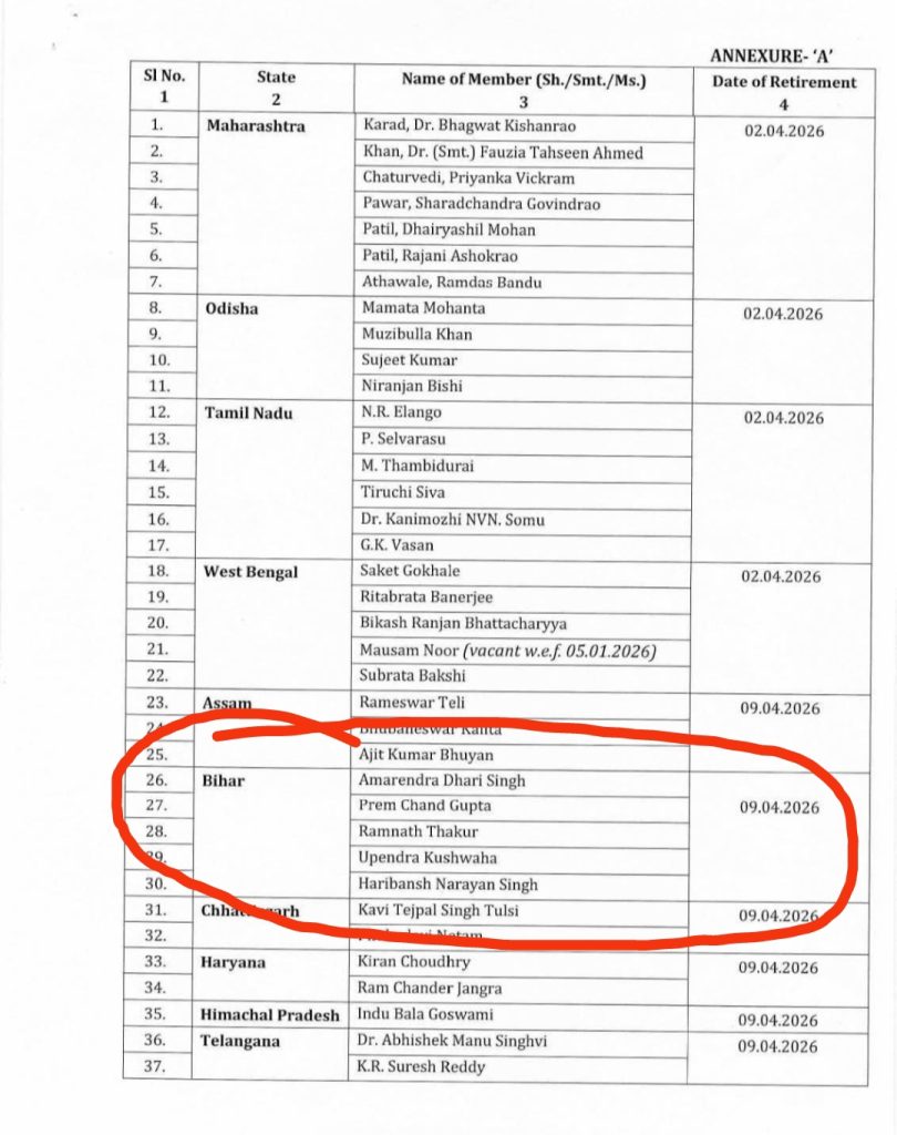 ​रामनाथ ठाकुर (JDU): जननायक कर्पूरी ठाकुर के पुत्र और वर्तमान केंद्रीय मंत्री रामनाथ ठाकुर का राज्यसभा सफर भी इस कार्यकाल के साथ संपन्न होगा।