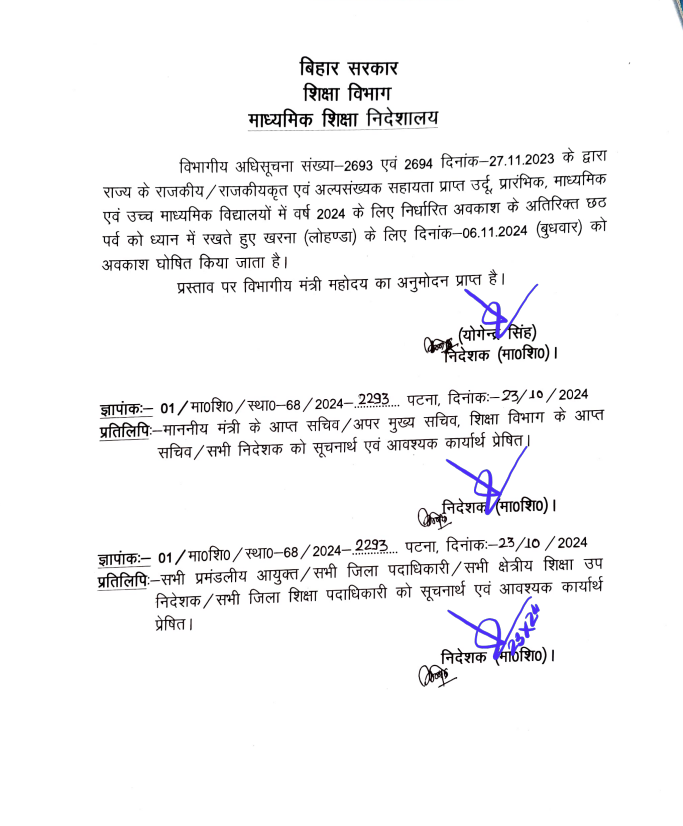 पहले जारी आदेश में 7-9 नवंबर तक अवकाश घोषित किया गया था. ऐसे में 5 और 6 नवंबर को छठ पूजा के दौरान नहाय-खाय एवं खरना के दिन भी स्कूल खुले रहने का कैलेंडर जारी हुआ था.