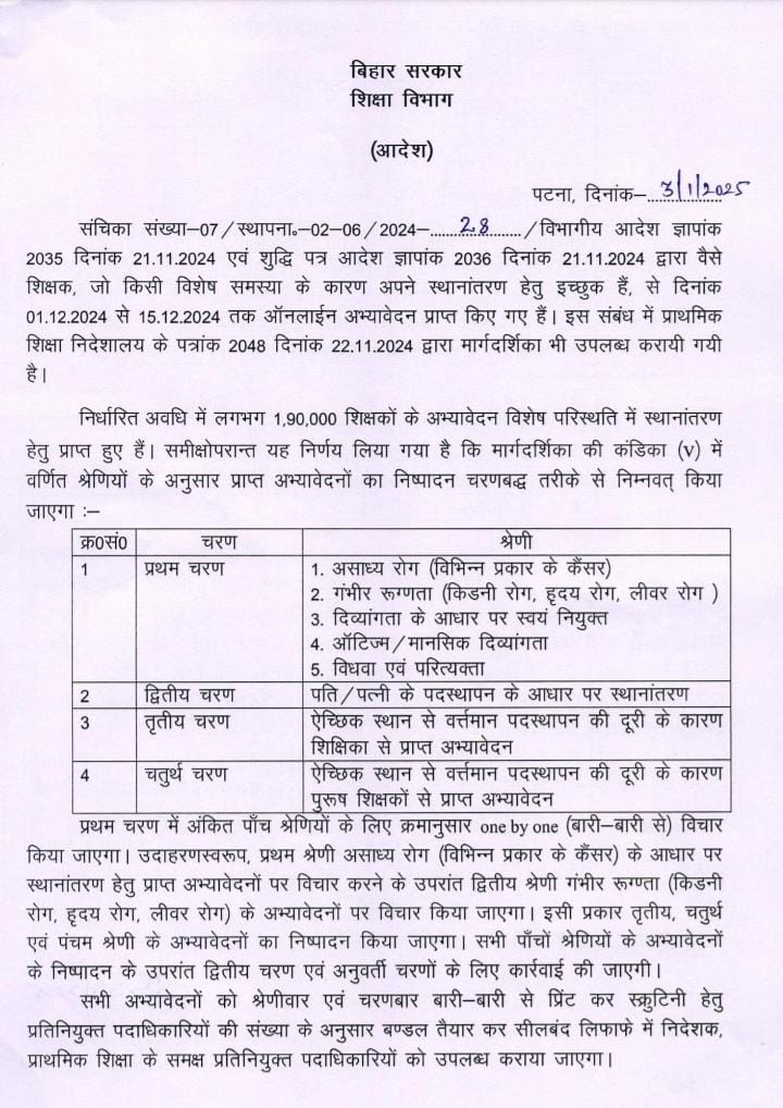 शिक्षा विभाग के निर्णय के अनुसार, प्रथम चरण में वैसे शिक्षक का स्थानांतरण होगा जो असाध्य रोग से ग्रसित है या दिव्यांग या विधवा या परित्यकता औरत है। दूसरे चरण में वैसे शिक्षकों का स्थानांतरण होगा जो पति-पत्नी के पदस्थापन के आधार पर स्थानांतरण मांग रहे हैं। तृतीय चरण में ऐक्षिक स्थान से वर्तमान पदस्थापन की दूरी के कारण जो शिक्षिका ने आवेदन दिया है वैसे शिक्षकों का स्थानांतरण किया जाएगा। वहीं चतुर्थ चरण में ऐच्छिक स्थान से वर्तमान पर स्थापना की दूरी के कारण पुरुष शिक्षकों ने जो आवेदन दिए हैं उसके आधार पर स्थानांतरण किया जाएगा।