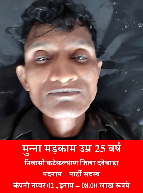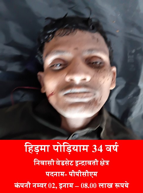 बीजापुर मुठभेड़ में मारे गए नक्सली हिड़मा पोडियम (34 वर्षीय) पीपीसीएम कंपनी नम्बर 02 का सदस्य था. जिसपर 8 लाख रुपए का इनाम घोषित था. वहीं दूसरा नक्सली मुन्ना मड़कम (25 वर्षीय) नंबर 01 सदस्य थे. यह भी 8 लाख रुपए का इनामी था.