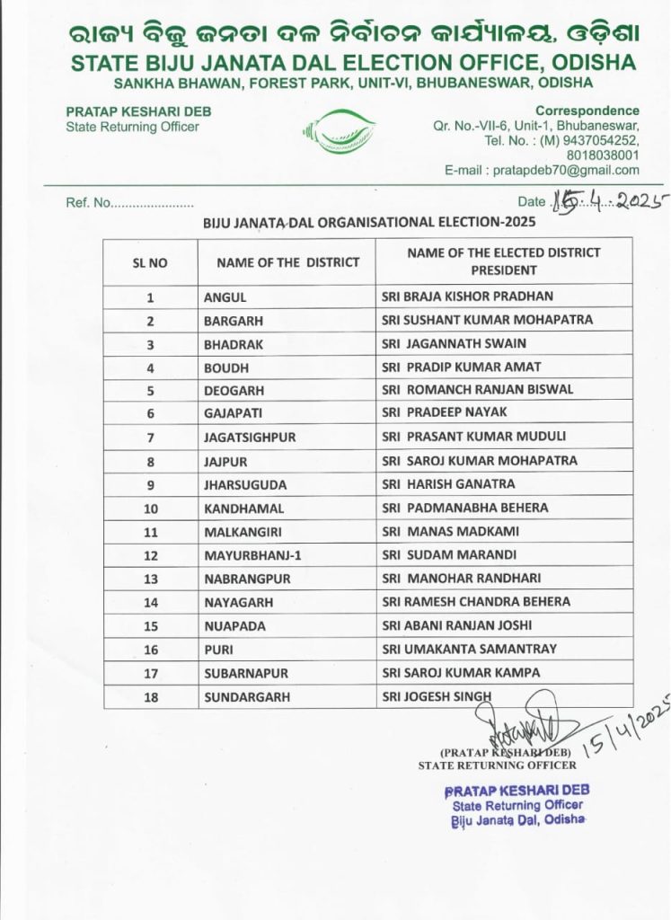 बीजद सुप्रीमो नवीन पटनायक की मंजूरी के बाद, राज्य निर्वाचन अधिकारी प्रताप केशरी देब ने 18 संगठनात्मक जिलों के जिला अध्यक्षों के नामों की घोषणा की।