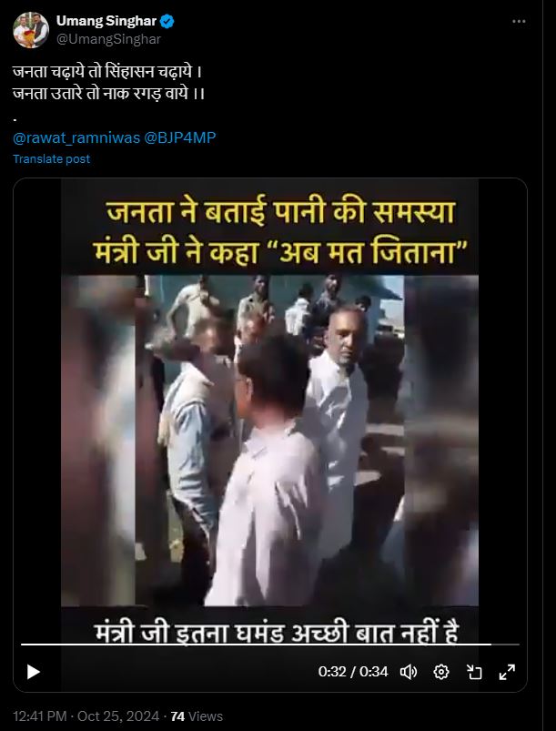नेता प्रतिपक्ष उमंग सिंघार ने सोशल मीडिया पर रामनिवास रावत का वीडियो शेयर कर लिखा, ‘जनता चढ़ाए तो सिंहासन चढ़ाये, उतारे तो नाक रगड़वाए।’ वीडियो में दिख रहा है कि रामनिवास रावत, ग्रामीणों के बीच पहुंचे। इस पर लोगों ने कह दिया कि आपको यहां आने में शर्म आनी चाहिए, कब से नहीं आए हो। रावत ने कहा कि 25 बार बैठ कर गया हूं, फ़ालतू बात मत करो।