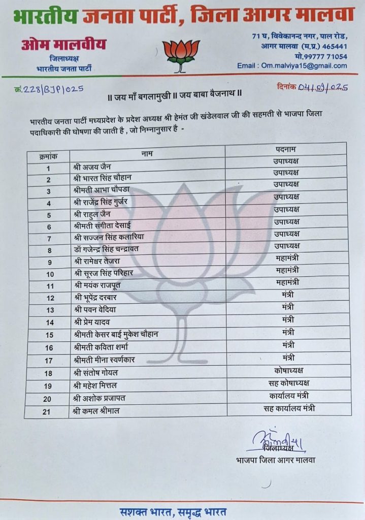 आगर मालवा कार्यकारिणी की लिस्ट में कुल 21 पदाधिकारियों का नाम है। जिसमें 8 उपाध्यक्ष, 3 महामंत्री, 6 मंत्री, 1 कोषाध्यक्ष, 1 सह कोषाध्यक्ष, 1 कार्यालय मंत्री और 1 सह कार्यालय मंत्री शामिल है।
