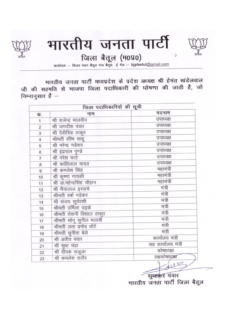 भाजपा ने बैतूल जिले में 8 उपाध्यक्ष, 3 महामंत्री, 8 मंत्री, 1 कार्यालय मंत्री, 1 सह कार्यालय मंत्री, 1 कोषाध्यक्ष और 1 सह कोषाध्यक्ष की घोषणा की है। इसी तरह, सीधी में 7 उपाध्यक्ष, 3 महामंत्री, 6 मंत्री, 1 कोषाध्यक्ष, 1 कार्यालय मंत्री और 1 सह कार्यालय मंत्री का ऐलान किया है।