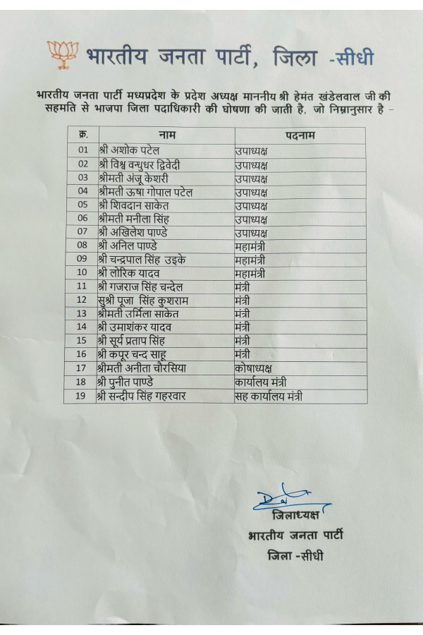 भोपाल। BJP District Executive: मध्य प्रदेश भाजपा ने सोमवार को दो और जिलों की कार्यकारिणी का ऐलान कर दिया है। बैतूल और सीधी में पदाधिकारियों को जिम्मेदारियां सौंप दिया गया है। बैतूल में 23 और सीधी में 19 नेताओं के नाम की घोषणा की गई है।