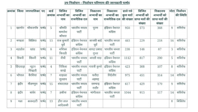 शब्बीर अहमद, भोपाल। राजधानी भोपाल सहित प्रदेश के 8 जिलों में हुए नगरीय निकाय उपचुनाव के परिणाम घोषित हो गए हैं। 9 पार्षदों के लिए हुए इन उपचुनावों में भारतीय जनता पार्टी (बीजेपी) ने शानदार प्रदर्शन करते हुए 6 वार्डों में जीत हासिल की है, जबकि कांग्रेस को 3 वार्डों में जीत मिली है। यह उपचुनाव भोपाल, इंदौर, छिंदवाड़ा, पन्ना, खरगोन, मंडला, सिवनी और शहडोल जिलों में संपन्न हुए।
