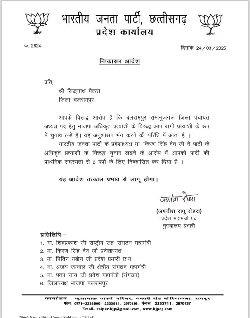 रायपुर. भाजपा ने पूर्व संसदीय सचिव सिद्धनाथ पैकरा को पार्टी से निष्काषित कर दिया है. उनपर आरोप है कि उन्होंने बागी होकर भाजपा अधिकृत प्रत्याशी के खिलाफ निर्दलीय चुनाव लड़ा था. इसके चलते उन्हें भाजपा प्रदेश प्रभारी किरण सिंह देव ने 6 साल के लिए पार्टी से निष्कासित कर दिया है.