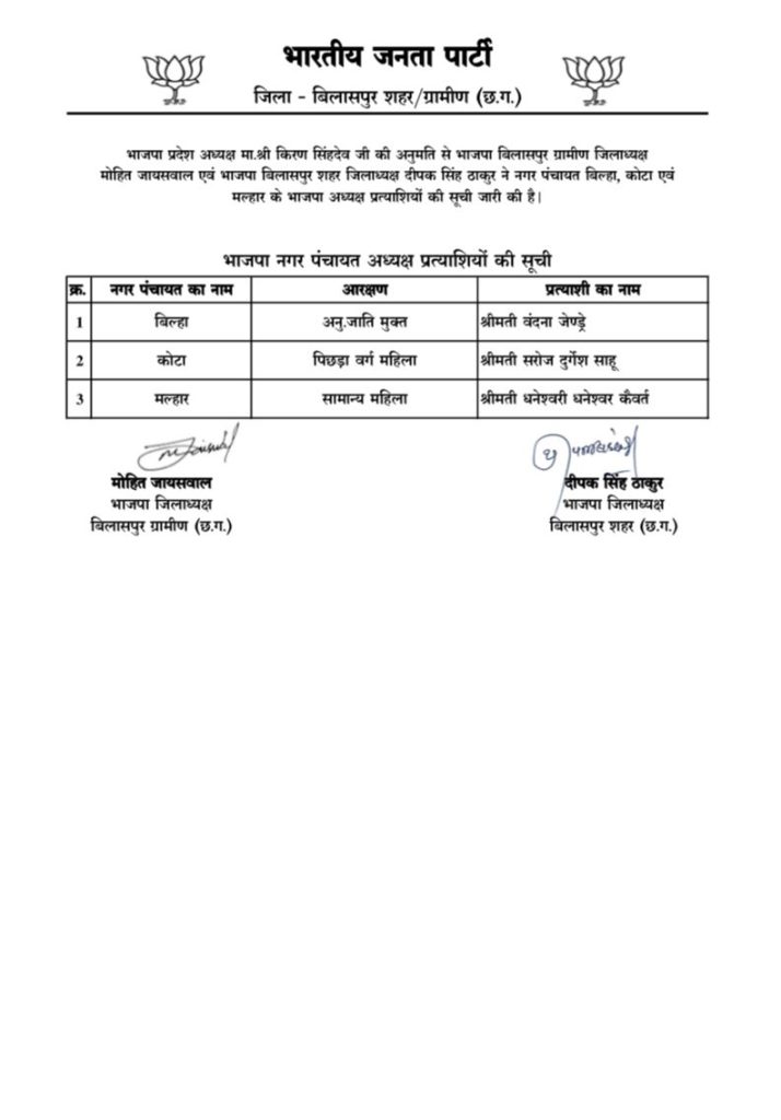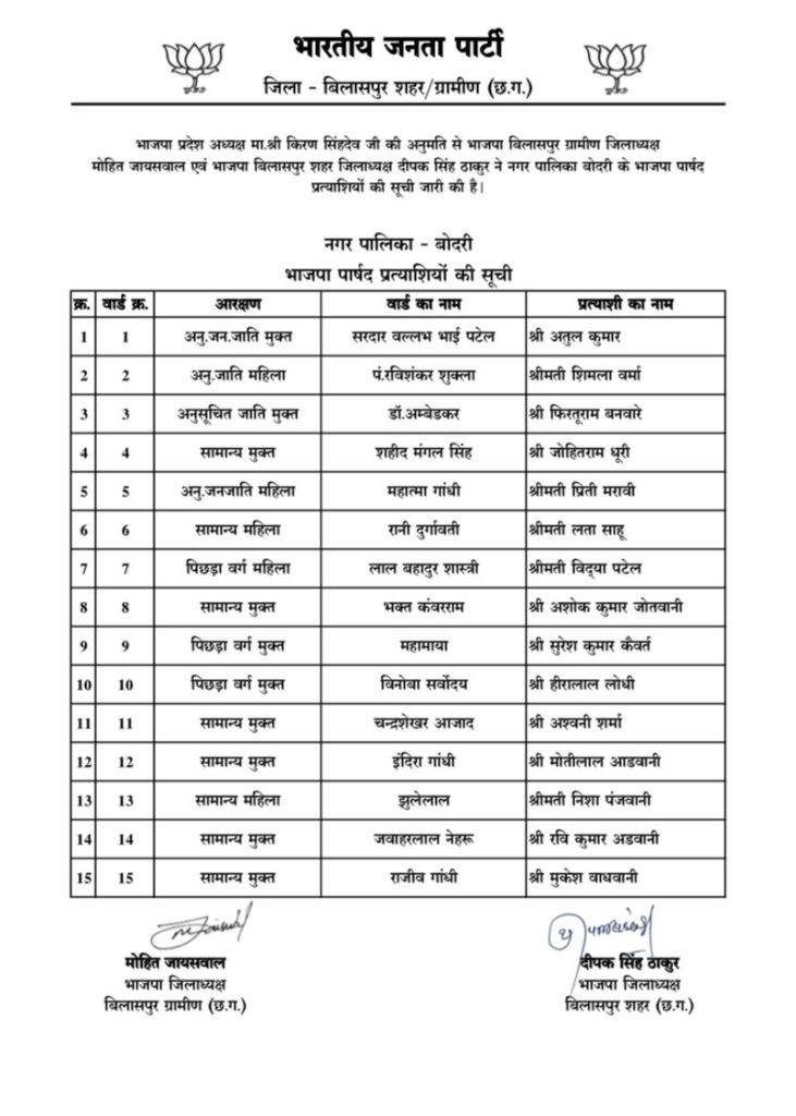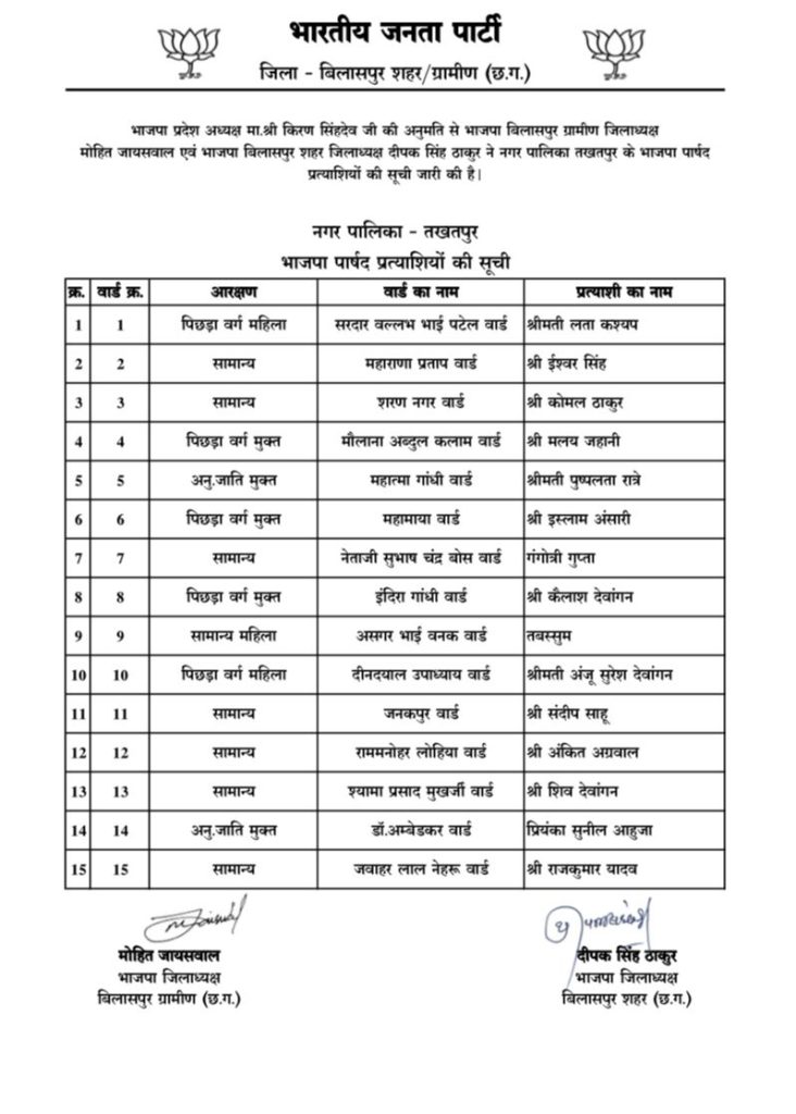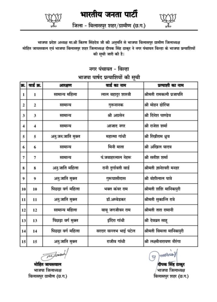 बिलासपुर। छत्तीसगढ़ में नगरीय निकाय चुनाव के लिए बीजेपी ने बिलासपुर संभाग के 3 जिलों में अपने प्रत्याशियों के नामों की सूची जारी कर दी है। इनमें बिलासपुर के बिल्हा, कोटा और मल्हार नगर पंचायतों के अध्यक्ष, जबकि बिलासपुर नगर निगम के 64 वार्डों में पार्षद, रतनपुर, तखतपुर और बोदरी नगर पालिका के 15-15 वार्डों में पार्षद, बिल्हा, कोटा और मल्हार, नगर पंचायत के 15-15 वार्डों में पार्षद , रायगढ़ की खरसिया नगर पालिका के 18 वार्डों में पार्षद, किरोड़ीमल और घरघोड़ा नगर पंचायत के 15-15 वार्डों में पार्षद। इसी तरह गौरेला-पेंड्रा-मरवाही की मरवाही नगर पंचायत में अध्यक्ष, गौरेला और पेंड्रा नगर पालिका में 15-15 वार्डों में पार्षद और मरवाही नगर पंचायत के 15 वार्डों में पार्षद प्रत्याशियों के नामों की सूची जारी की गई है।