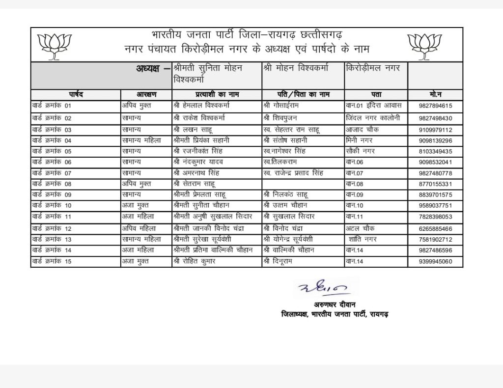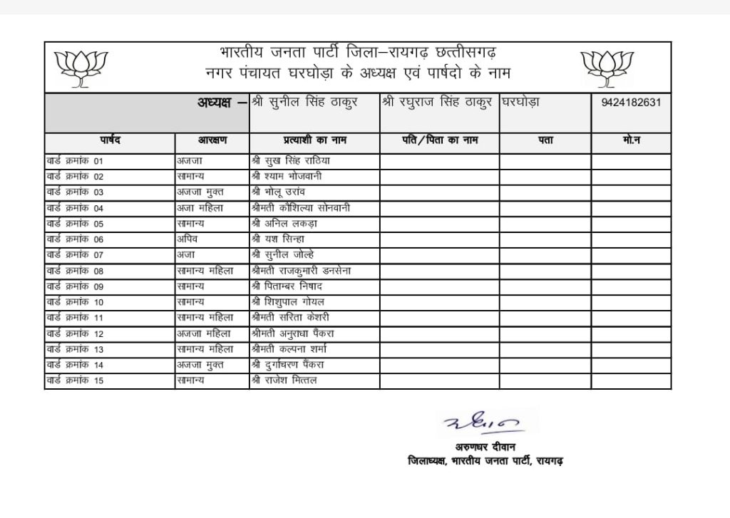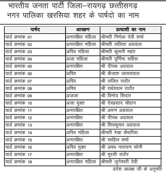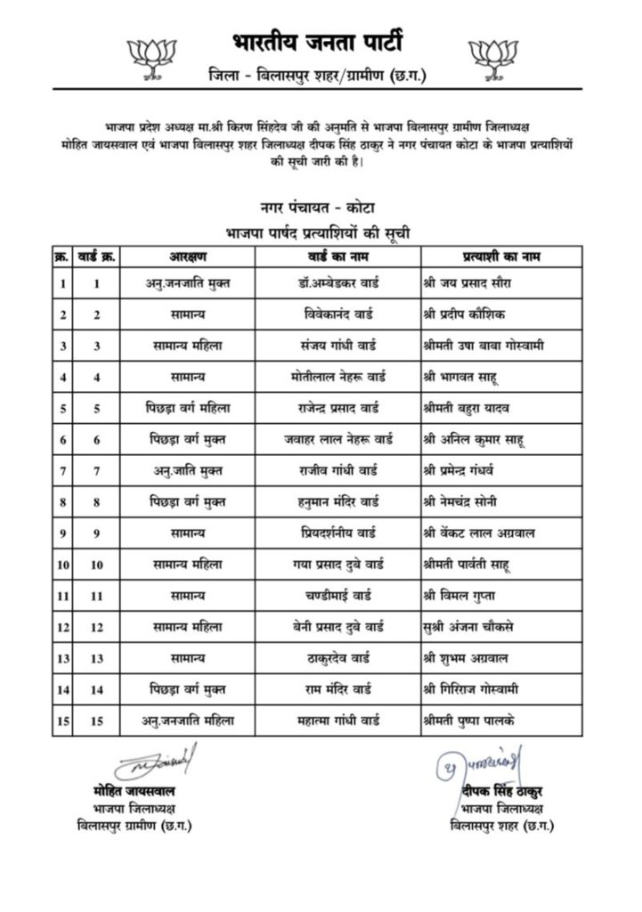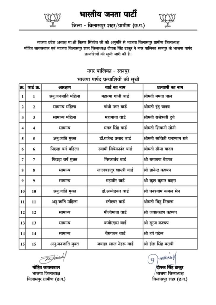 बिलासपुर। छत्तीसगढ़ में नगरीय निकाय चुनाव के लिए बीजेपी ने बिलासपुर संभाग के 3 जिलों में अपने प्रत्याशियों के नामों की सूची जारी कर दी है। इनमें बिलासपुर के बिल्हा, कोटा और मल्हार नगर पंचायतों के अध्यक्ष, जबकि बिलासपुर नगर निगम के 64 वार्डों में पार्षद, रतनपुर, तखतपुर और बोदरी नगर पालिका के 15-15 वार्डों में पार्षद, बिल्हा, कोटा और मल्हार, नगर पंचायत के 15-15 वार्डों में पार्षद , रायगढ़ की खरसिया नगर पालिका के 18 वार्डों में पार्षद, किरोड़ीमल और घरघोड़ा नगर पंचायत के 15-15 वार्डों में पार्षद। इसी तरह गौरेला-पेंड्रा-मरवाही की मरवाही नगर पंचायत में अध्यक्ष, गौरेला और पेंड्रा नगर पालिका में 15-15 वार्डों में पार्षद और मरवाही नगर पंचायत के 15 वार्डों में पार्षद प्रत्याशियों के नामों की सूची जारी की गई है।