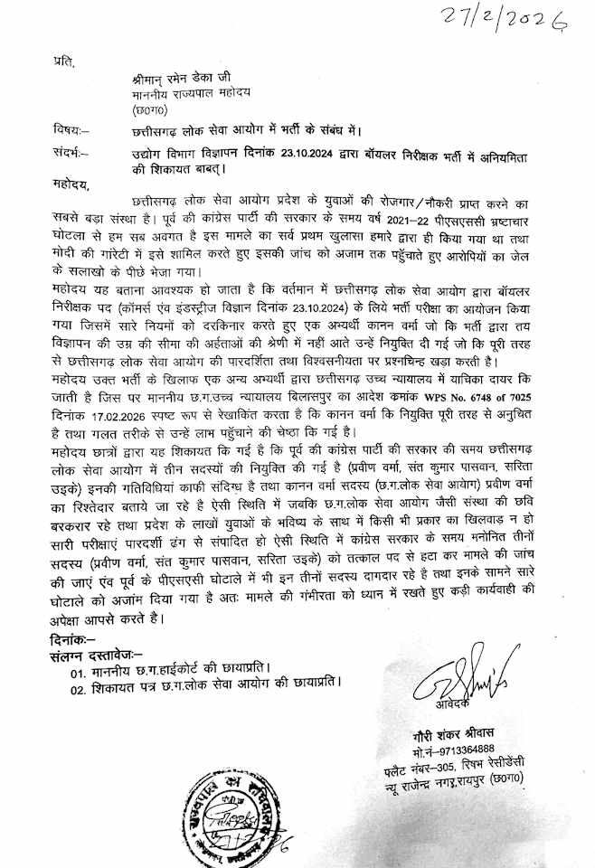 रायपुर। छत्तीसगढ़ लोक सेवा आयोग (PSC) एक बार फिर सुर्खियों में है, अबकी बार मामला उद्योग विभाग में बायलर इंस्पेक्टर के पद पर भर्ती का है, जिसमें चयनित अभ्यर्थी की योग्यता पर भाजपा नेता गौरीशंकर श्रीवास ने सवाल उठाते हुए राज्यपाल से शिकायत करते हुए निष्पक्ष जांच की मांग की है.