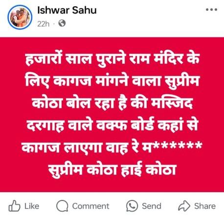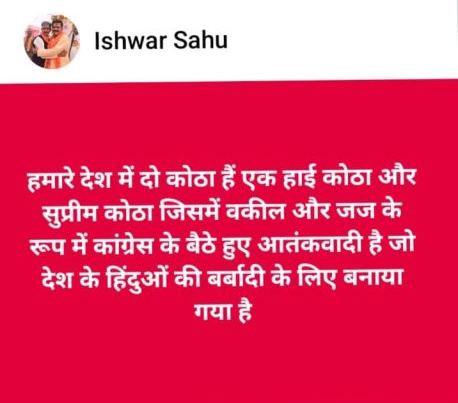 रायपुर. सुप्रीम कोर्ट पर अभद्र टिप्पणी करके भाजपा विधायक ईश्वर विवादों में आ गए हैं. एक के बाद कई पोस्ट ईश्वर साहू के फेसबुक पेज से हुआ है, जिसमें उन्होंने सुप्रीम कोट के लिए आपत्तिजनक शब्द का कोठा का इस्तेमाल किया है. उनके इस पोस्ट के बाद छत्तीसगढ़ में सियासी बवाल भी मच गया. कांग्रेस ने इस पर कड़ी आपत्ति करते हुए कहा कि विधायक को शर्म आनी चाहिए. उन्हें अपने इस कृत्य के लिए माफी मांगनी चाहिए.