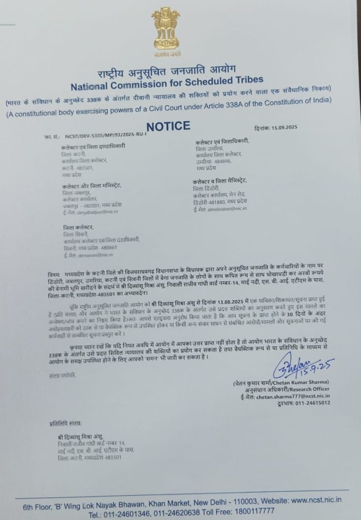 अंशु मिश्रा ने बताया कि आयोग ने कलेक्टरों को नोटिस जारी कर कहा है कि 4 आदिवासी जो संजय पाठक के बंगले पर काम करते हैं, उनके नाम पर जमीने खरीदी गई हैं। वे सभी गरीबी रेखा के नीचे जीवन यापन कर रहे हैं। आयोग ने 30 दिनों के अंदर जवाब देने के निर्देश जारी किए हैं। उमरिया, डिंडोरी, कटनी, जबलपुर और सिवनी के कलेक्टर को नोटिस दिया गया है।