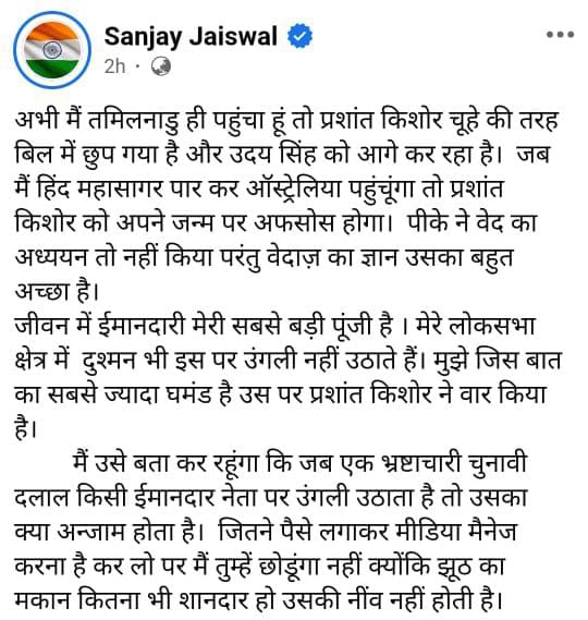 डॉ. जायसवाल ने लिखा कि उनकी ईमानदारी ही उनकी सबसे बड़ी पूंजी है, और उनके लोकसभा क्षेत्र में दुश्मन भी उनकी ईमानदारी पर सवाल नहीं उठा सकते। उन्होंने कहा कि उन्हें इस बात का घमंड है और पीके ने उसी पर वार करने की कोशिश की है।