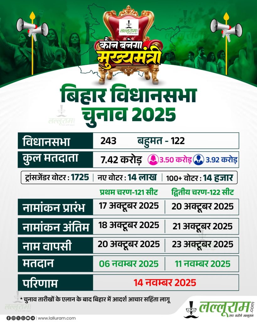 आपको बता दें कि बिहार में दो चरणों में विधानसभा चुनाव होने है। पहला चरण 6 नवंबर को 121 सीटों पर और 11 नवंबर को 122 सीटों पर वोटिंग होगी। वहीं 14 नवंबर को रिजल्ट घोषित किया जाएगा।