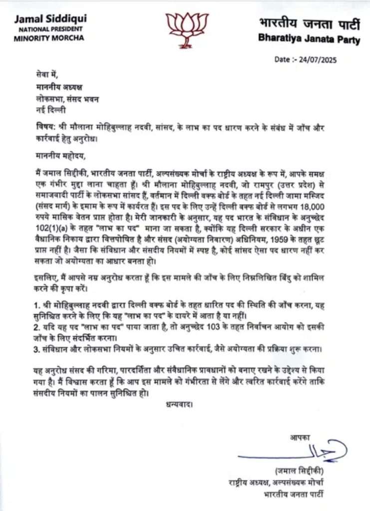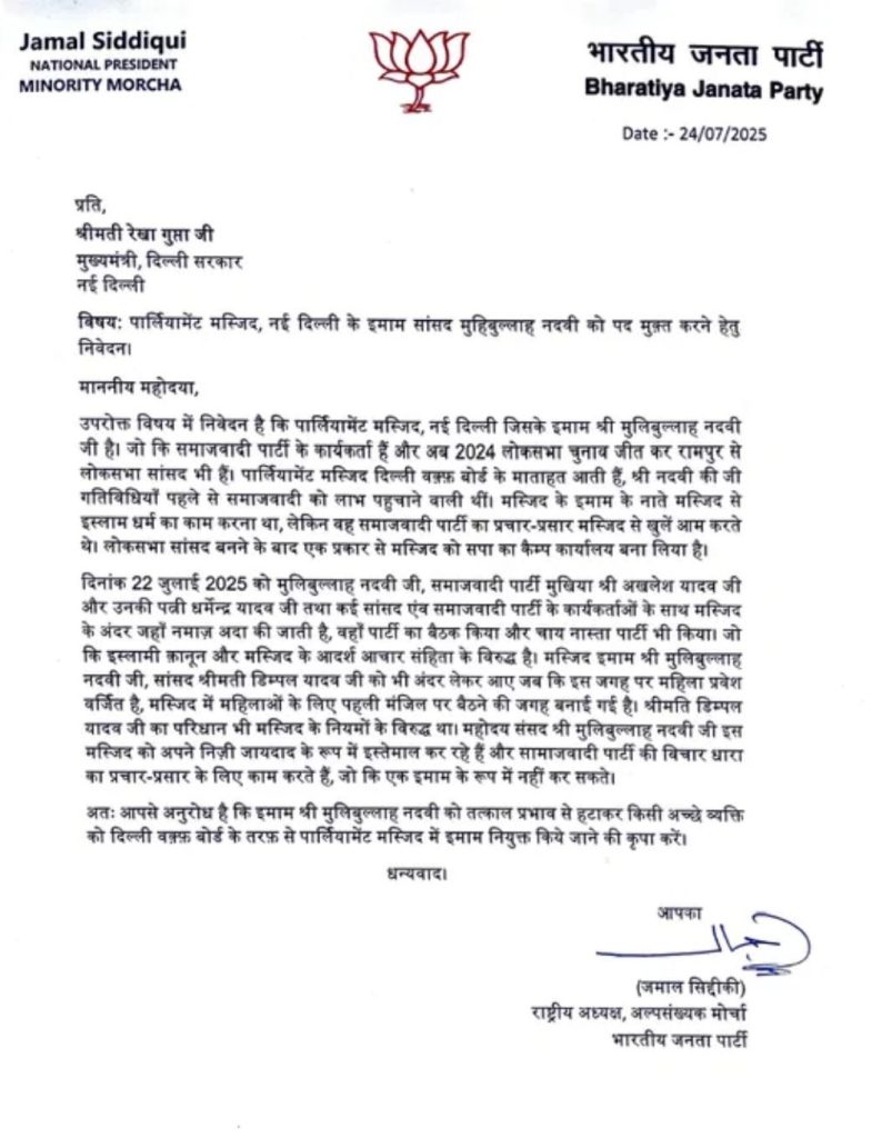 भारतीय जनता पार्टी (BJP) के राष्ट्रीय अल्पसंख्यक मोर्चा के अध्यक्ष जमाल सिद्दीकी ने लोकसभा स्पीकर ओम बिरला (Om Birla)और दिल्ली की मुख्यमंत्री रेखा गुप्ता(Rekha Gupta) को एक पत्र भेजकर यह जानने की मांग की है कि क्या समाजवादी पार्टी (SP) के सांसद मोहिबुल्लाह नदवी द्वारा दिल्ली वक्फ बोर्ड के अधीन संसद मार्ग पर स्थित जामा मस्जिद के इमाम का पद लाभ के पद की श्रेणी में आता है. इसके साथ ही, उन्होंने इमाम पद से हटाने की भी अपील की है.