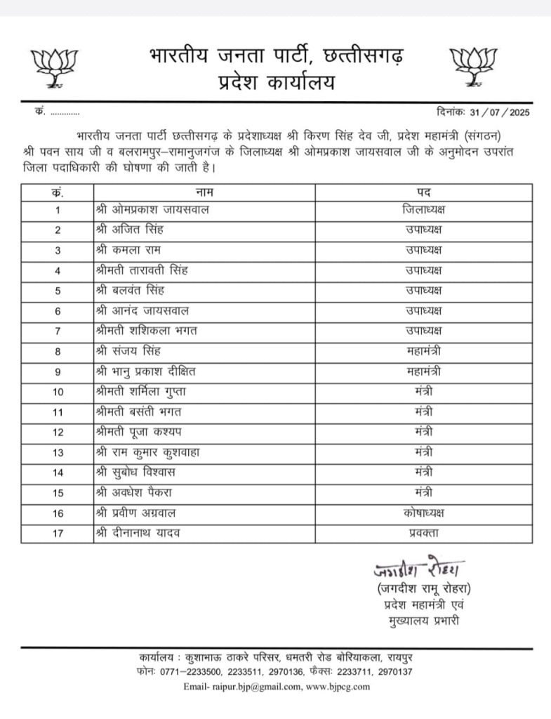 प्रदेश कार्यालय से जारी सूची के अनुसार, ओमप्रकाश जायसवाल को जिलाध्यक्ष बनाया गया है। उपाध्यक्ष पद पर अजित सिंह, कमला राम, तारावती सिंह, बलवंत सिंह, आनंद जायसवाल और शशिकला भगत को नियुक्त किया गया है। महामंत्री के रूप में संजय सिंह और भानु प्रकाश दीक्षित, जबकि मंत्री पद पर शर्मिला गुप्ता, बसंती भगत, पूजा कश्यप, राम कुमार कुशवाहा, सुबोध विश्वास और अवधेश पैकरा को जगह मिली है। इसके अलावा प्रवीण अग्रवाल को कोषाध्यक्ष और दीनानाथ यादव को प्रवक्ता नियुक्त किया गया है।