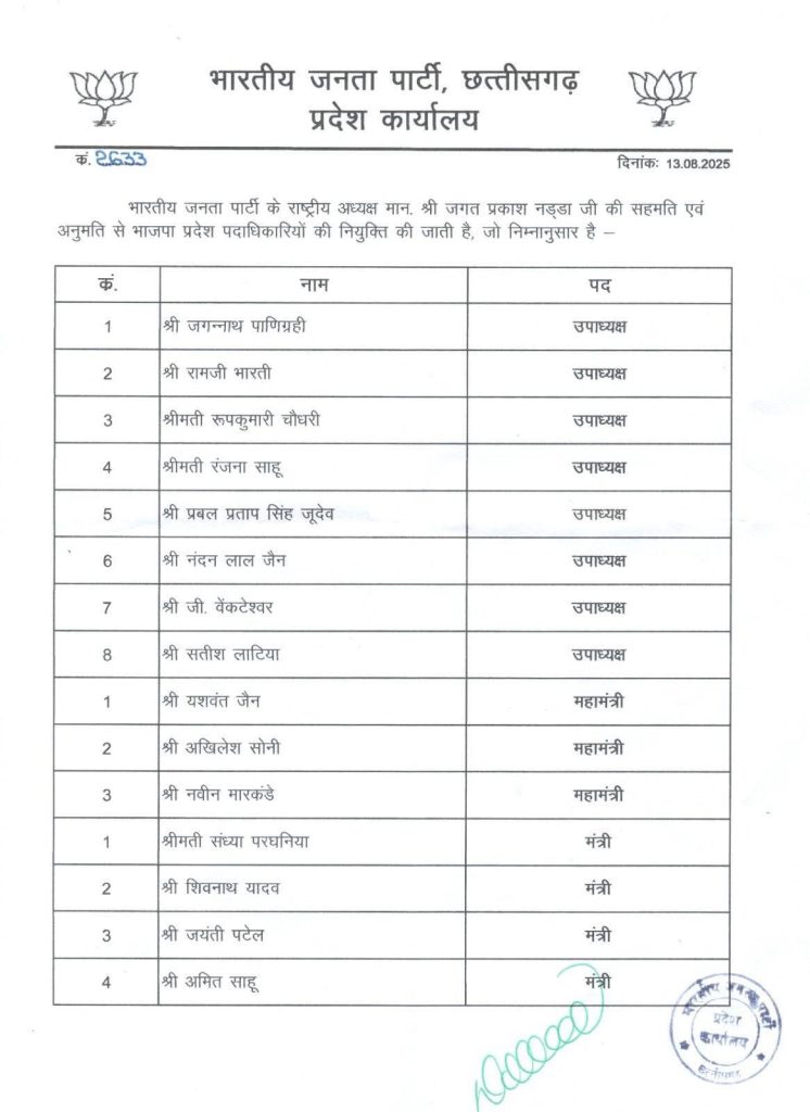 रायपुर। भारतीय जनता पार्टी प्रदेश अध्यक्ष किरण सिंहदेव की नई टीम का ऐलान हो गया है. नई टीम में नए चेहरों को स्थान दिया गया है.