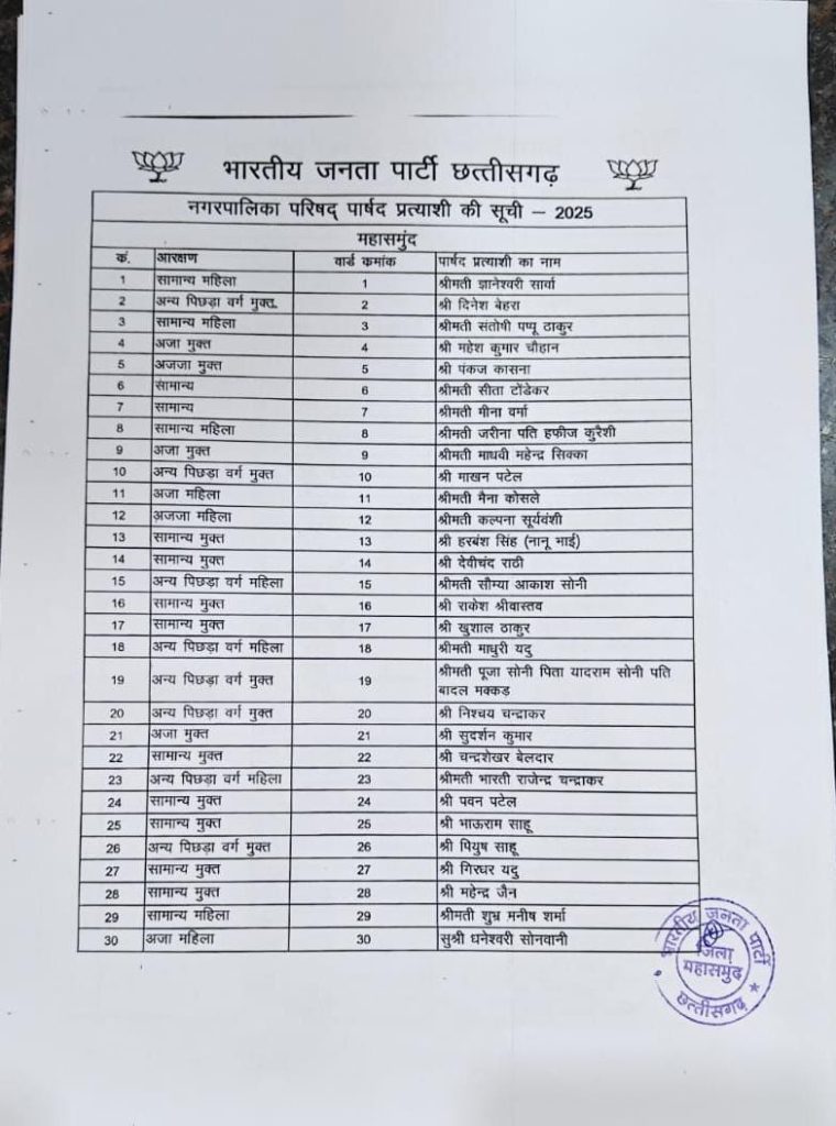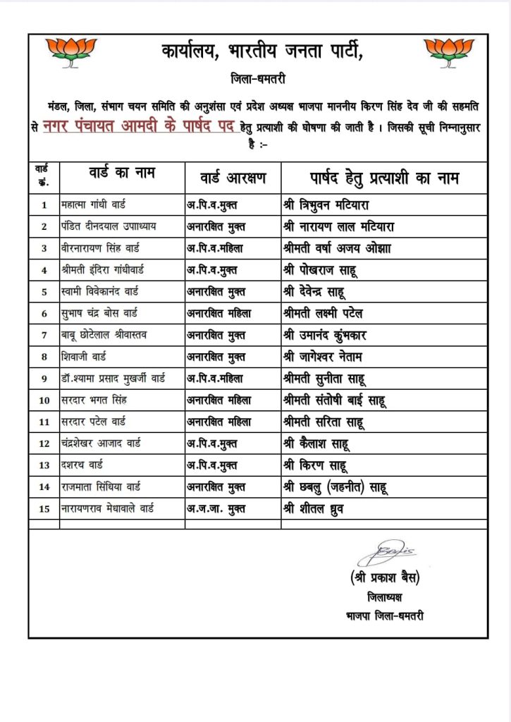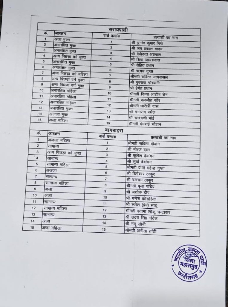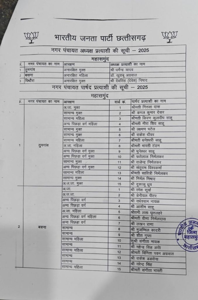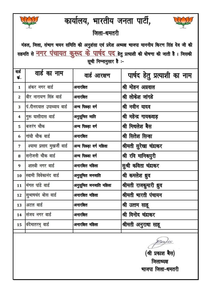 महासमुंद/धमतरी। महासमुंद और धमतरी जिले में आगामी नगरीय निकाय चुनावों के लिए भारतीय जनता पार्टी ने अपने प्रत्याशियों के नामों की घोषणा कर दी है। इनमें महासमुंद की पिथौरा, तुमगांव और बसना नगर पंचायतों के अध्यक्ष, महासमुंद नगर पालिका के 30 वार्डों के पार्षद, जबकि तुमगांव, सरायपाली, बागबाहरा और बसना नगर पंचायत के 15-15 वार्डों के पार्षद प्रत्याशियों के नामों का ऐलान किया गया है। इसी तरह धमतरी जिले की 5 नगर पंचायतों कुरुद, भखारा, आमदी, नगरी और मगरलोड के 15-15 वार्डों में पार्षद प्रत्याशियों के नामों की घोषणा की गई है। वहीं सारंगढ़-बिलाईगढ़ के सभी नगर पंचायत अध्यक्ष और पार्षदों के नाम का ऐलान कर दिया गया है।
