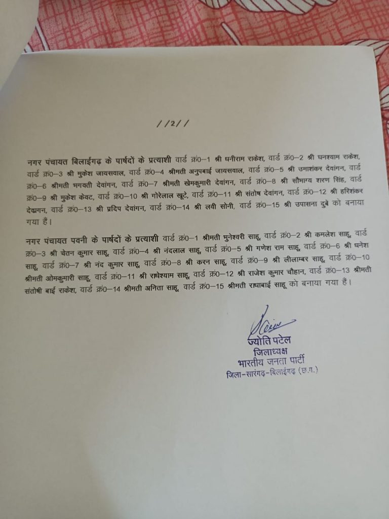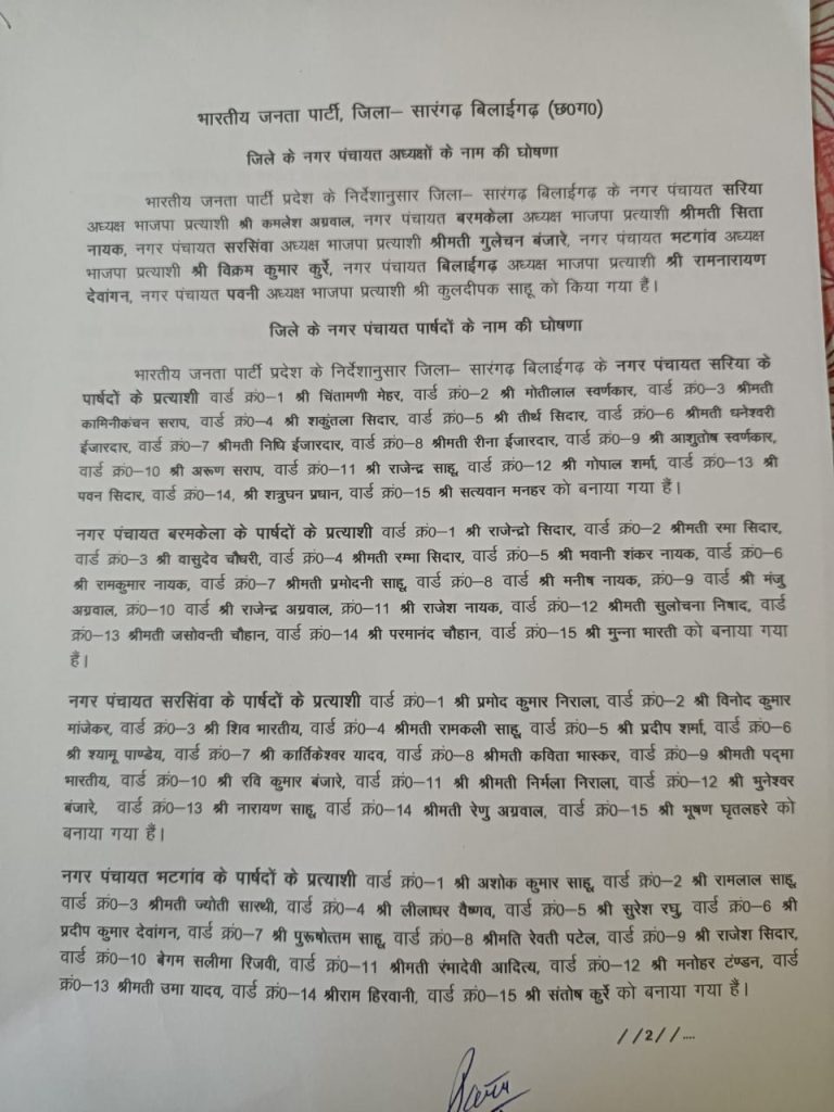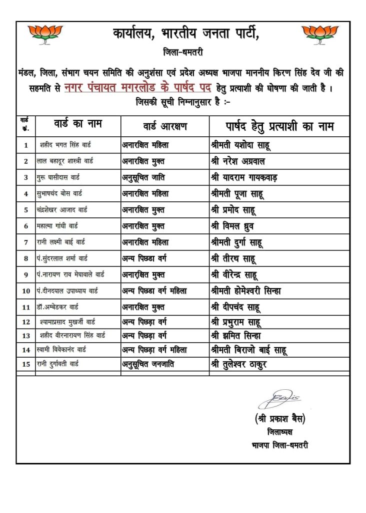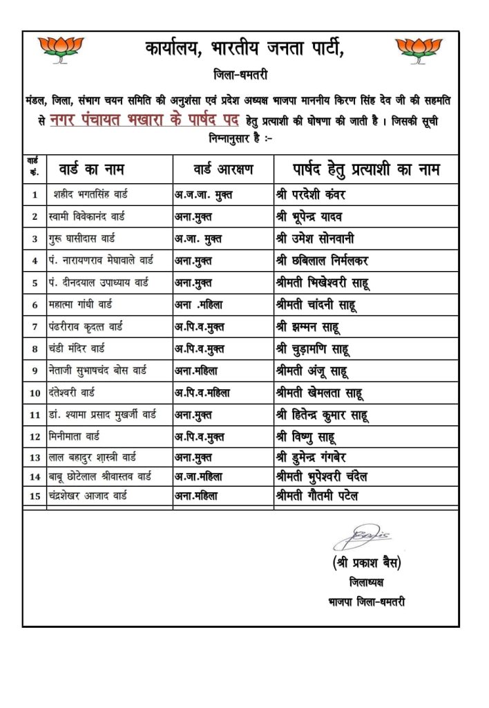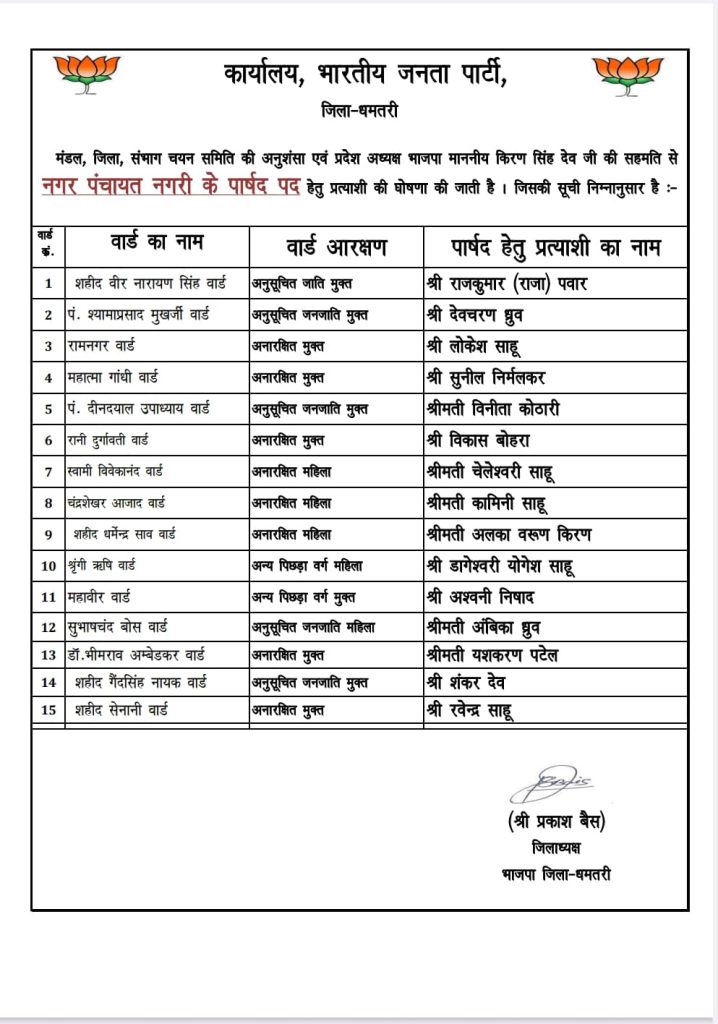 महासमुंद/धमतरी। महासमुंद और धमतरी जिले में आगामी नगरीय निकाय चुनावों के लिए भारतीय जनता पार्टी ने अपने प्रत्याशियों के नामों की घोषणा कर दी है। इनमें महासमुंद की पिथौरा, तुमगांव और बसना नगर पंचायतों के अध्यक्ष, महासमुंद नगर पालिका के 30 वार्डों के पार्षद, जबकि तुमगांव, सरायपाली, बागबाहरा और बसना नगर पंचायत के 15-15 वार्डों के पार्षद प्रत्याशियों के नामों का ऐलान किया गया है। इसी तरह धमतरी जिले की 5 नगर पंचायतों कुरुद, भखारा, आमदी, नगरी और मगरलोड के 15-15 वार्डों में पार्षद प्रत्याशियों के नामों की घोषणा की गई है। वहीं सारंगढ़-बिलाईगढ़ के सभी नगर पंचायत अध्यक्ष और पार्षदों के नाम का ऐलान कर दिया गया है।
