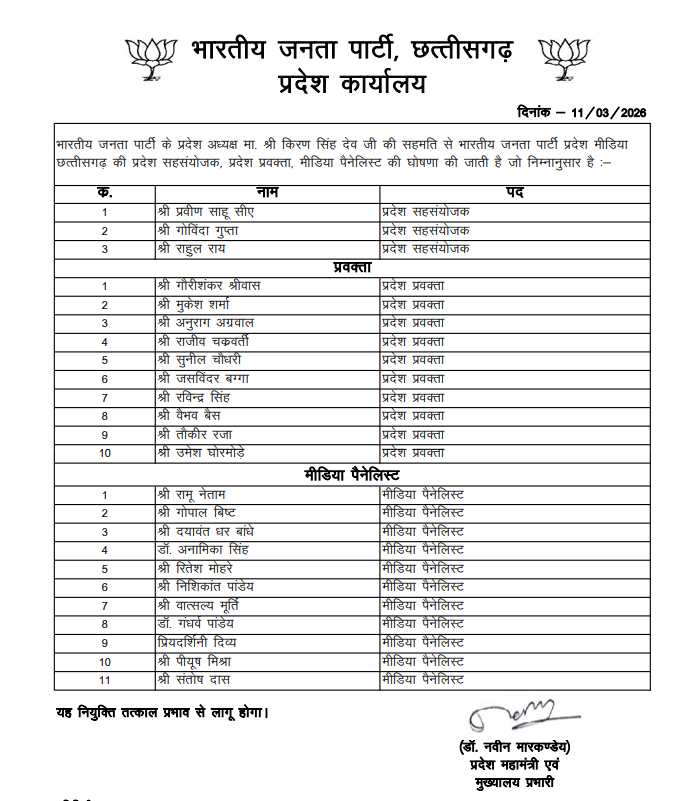रायपुर। भाजपा के प्रदेश अध्यक्ष किरण सिंह देव की सहमति से पार्टी की छत्तीसगढ़ प्रदेश मीडिया टीम की नई सूची जारी कर दी गई है। इसमें प्रदेश स्तर पर 3 सहसंयोजक, 10 प्रदेश प्रवक्ता और 11 मीडिया पैनलिस्ट की नियुक्ति की गई है।