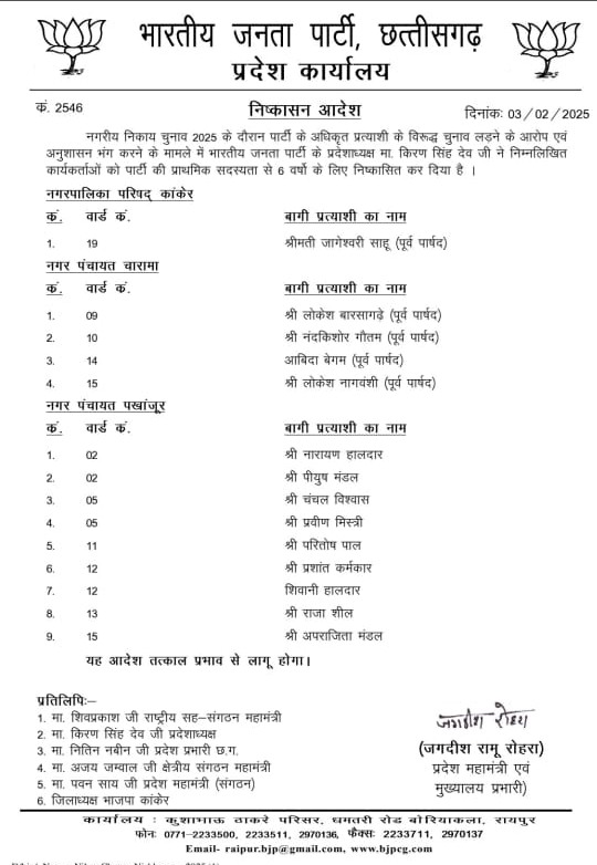 इस कार्रवाई में कांकेर नगर पालिका से जागेश्वरी साहू, चारामा नगर पंचायत से 4 और पखांजूर नगर पंचायत 9 प्रत्याशीयो को 6 साल के लिए पार्टी से निष्काषित किया गया है. इनमें 5 नेता ऐसे भी हैं जो पूर्व में पार्षद भी रहे हैं.