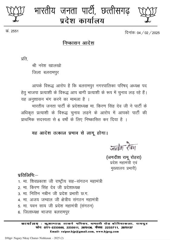 भाजपा की गाज सबसे पहले बलरामपुर नगर पालिका परिषद अध्यक्ष पद के लिए लड़ रहे बागी प्रत्याशी नरेश खलखो पर गिरी है. जिन्हें छह वर्षों के लिए निष्कासित किया गया है.