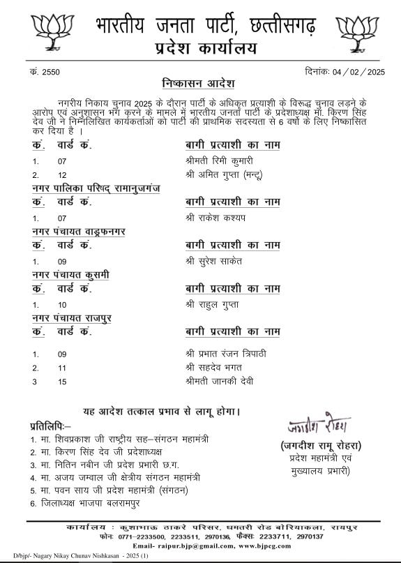 सुदीप उपाध्याय, बलरामपुर। भारतीय जनता पार्टी ने नगरीय निकाय चुनाव 2025 के दौरान पार्टी के अधिकृत प्रत्याशी के विरूद्ध चुनाव लड़ने पर एक बागी नगर पालिका अध्यक्ष प्रत्याशी और आठ पार्षद प्रत्याशियों को पार्टी की प्राथमिक सदस्यता से 6 वर्षो के लिए निष्कासित किया है.