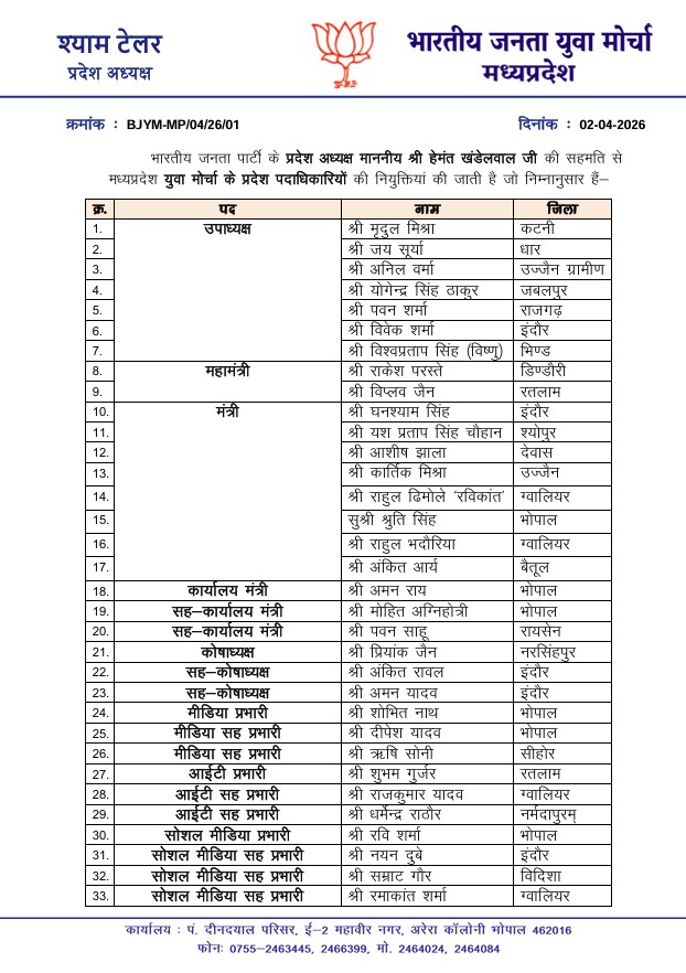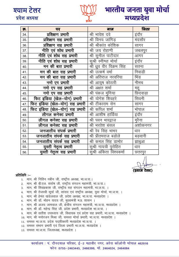 राकेश चतुर्वेदी, भोपाल। भारतीय जनता पार्टी (BJP) युवा मोर्चा मध्य प्रदेश की नई 56 सदस्यीय कार्यकारिणी का ऐलान कर दिया गया है। इस टीम में 7 उपाध्यक्ष, 2 महामंत्री और 8 मंत्री सहित अन्य महत्वपूर्ण पदों पर युवा नेताओं को जिम्मेदारी सौंपी गई है।