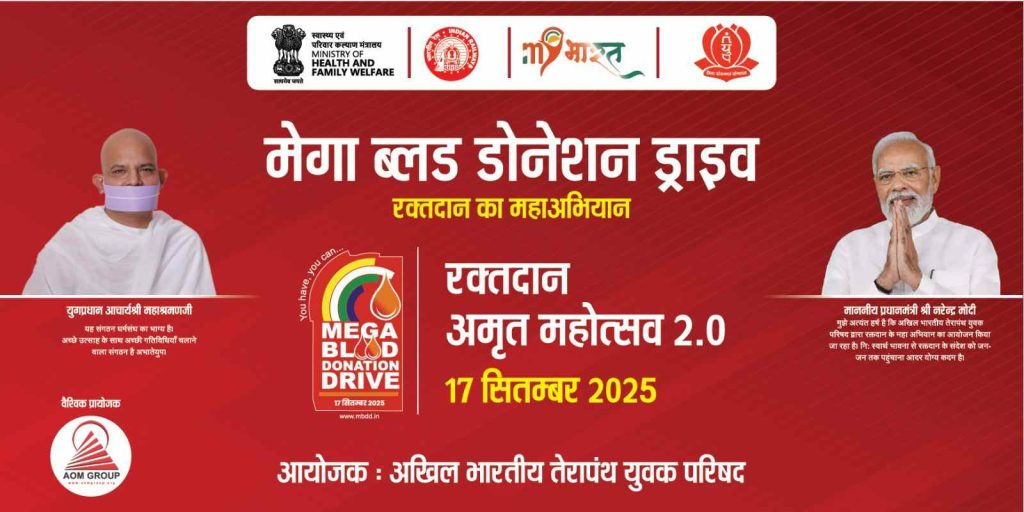 अखिल भारतीय तेरापंथ युवक परिषद की ओर से गत 10 वर्षों में आयोजित मेगा रक्तदान शिविरों में 10 लाख से अधिक यूनिट रक्त एकत्र किया जा चुका है। इस बार फिर से कीर्तिमान रचने की तैयारी है। छत्तीसगढ़ में कहीं भी आपको 17 सितंबर को होने वाले मेगा ब्लड डोनेशन ड्राइव में जुड़ने के लिए Prateek jain मोबाइल नंबर +91 93037 70007, Deepesh pugalia 90389 66339, Shubham baid +91 90623 05017 से संपर्क कर सकते हैं।