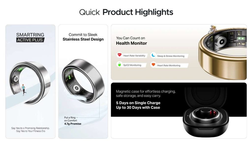 SmartRing Active Plus को कंपनी ने 6 अलग-अलग साइज (7 से लेकर 12 तक) में पेश किया है, ताकि हर किसी को अपने हाथ के अनुसार सही फिटिंग मिल सके.