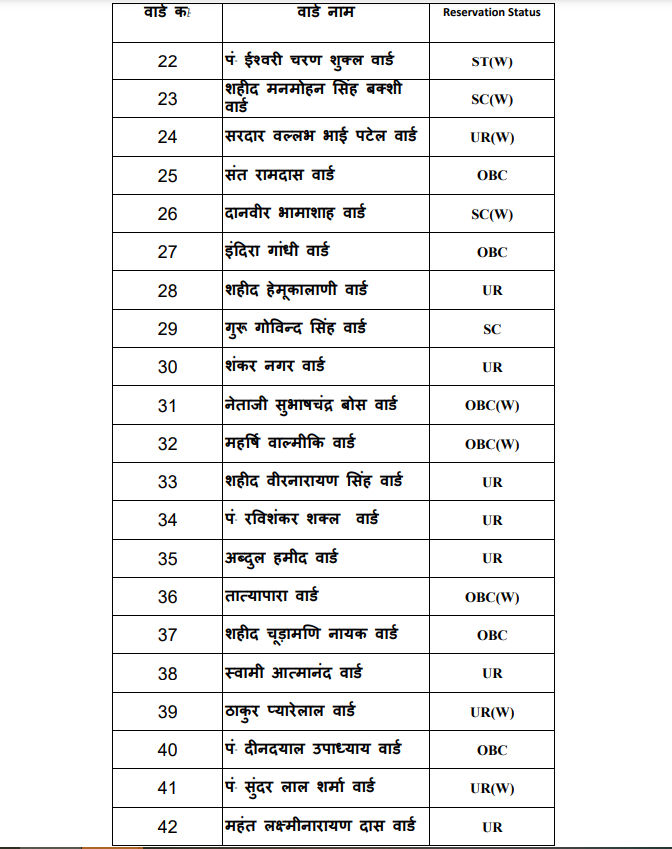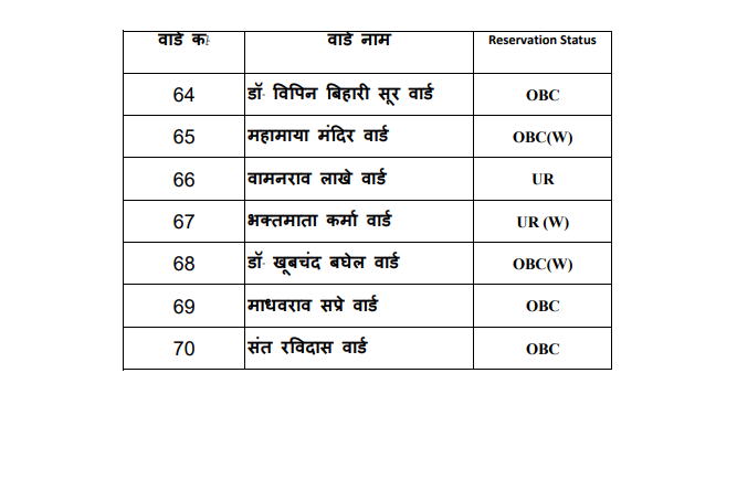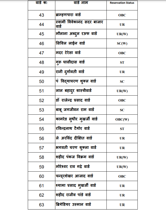 सत्यपाल राजपूत, रायपुर. राजधानी रायपुर के शहीद स्मारक भवन में रायपुर के 70 वार्डों के लिए आरक्षण सूची जारी हो गई है. प्रक्रिया का उद्देश्य आगामी चुनावों में सभी वर्गों का समान प्रतिनिधित्व सुनिश्चित करना है.