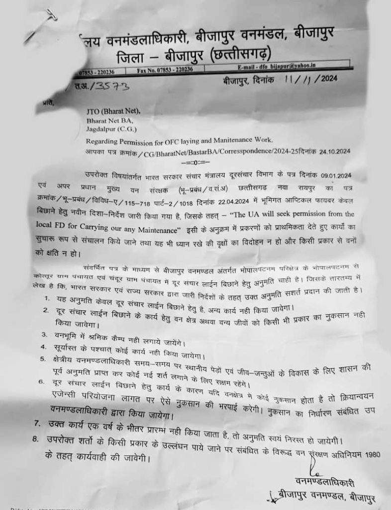 सुरेश परतागिरी, बीजापुर। जंगल के विशालकाय पेड़ों को गिराकर संचार कंपनी बीएसएनएल का ऑप्टिकल फाइबर केबल (ओएफसी) बिछाया जा रहा था. मामले की जानकारी होने पर वन अमले ने कार्रवाई करते हुए कार्य में लगे तीन जेसीबी को जब्त किया है. इसके साथ ही वन विभाग कंपनी को नोटिस जारी करने जा रहा है. यह भी पढ़ें : बड़ी खबर : रेल मंत्री अश्विनी वैष्णव का रायपुर दौरा रद्द…