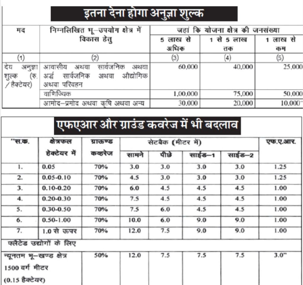 भूखंड क्षेत्रफल के मामले में बदलाव करते हुए 12.5 मीटर और 21 मीटर को अब राउंड फिगर में 15 मीटर और 24 मीटर कर दिया गया है। इसके साथ ही शुल्क 30% से बढ़ाकर 40% कर दिया गया है।