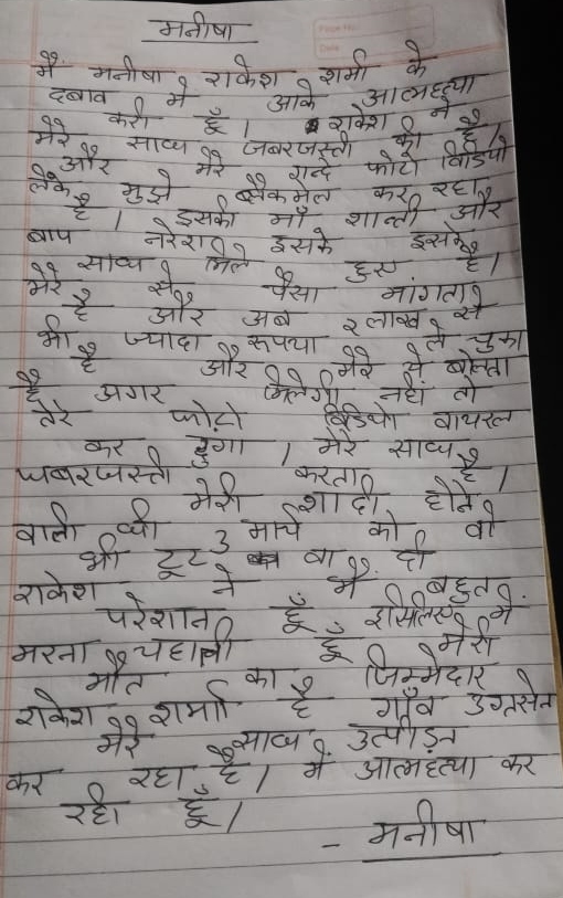 युवती ने चिट्ठी के माध्यम से बताया कि मैं मनीषा, राकेश शर्मा के दबाव में आकर आत्महत्या कर रही हूं। राकेश ने मेरे साथ जबरदस्ती की और मेरे गंदे फोटो-वीडियो लेकर लगातार ब्लैकमेल कर रहा था। उसकी मां शांति और पिता नरेश भी उसके साथ मिले हुए है। वो मुझसे वीडियो के बदल 2 लाख रूपए से ज्यादा ले चुका है। मेरे से कहता है कि अगर मिलेगी नहीं तो फोटो वीडियो वायरल कर दूंगा।
