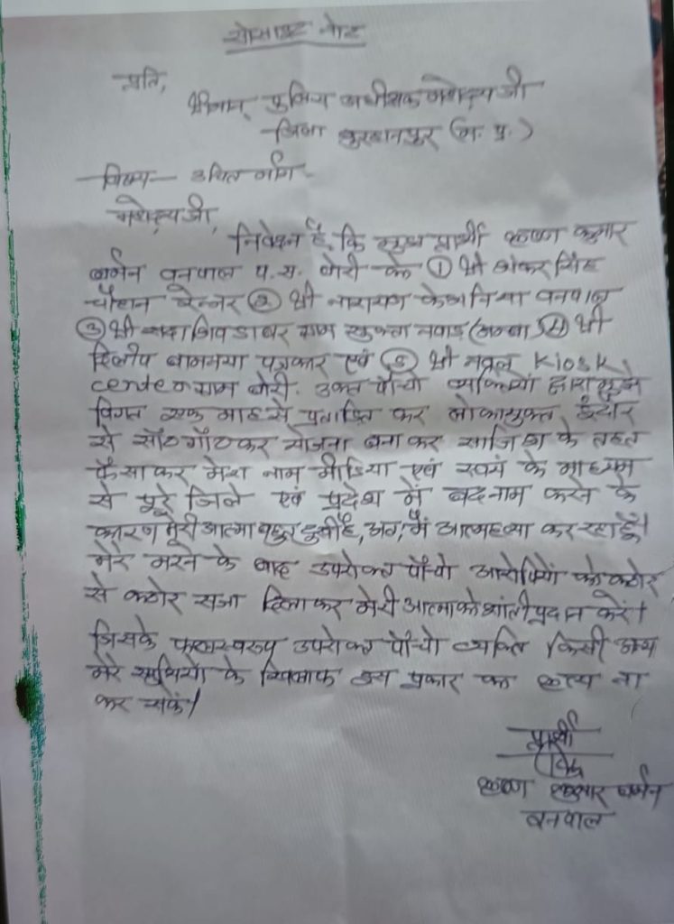 सोशल मीडिया पर एक सुसाइड नोट भी वायरल हो रहा है। जिसमें वनपाल बर्मन ने पांच लोगों पर गंभीर आरोप लगाए है। हालांकि लल्लूराम डॉट कॉम इस सुसाइड नोट के सत्यता की पुष्ट नहीं करता है। घटना की सूचना पर नेपानगर थाना पुलिस मौके पर पहुंचकर पूछताछ की है। वनपाल बर्मन ने खुद को गोली क्यों मारी ? फिलहाल इसकी जांच पड़ताल की जा रही है। आपको बता दें कि कृष्ण कुमार बर्मन नेपा लिमिटेड के मकान में निवासरत थे।