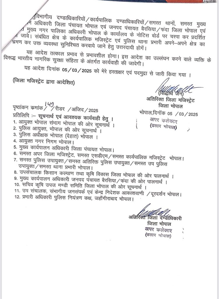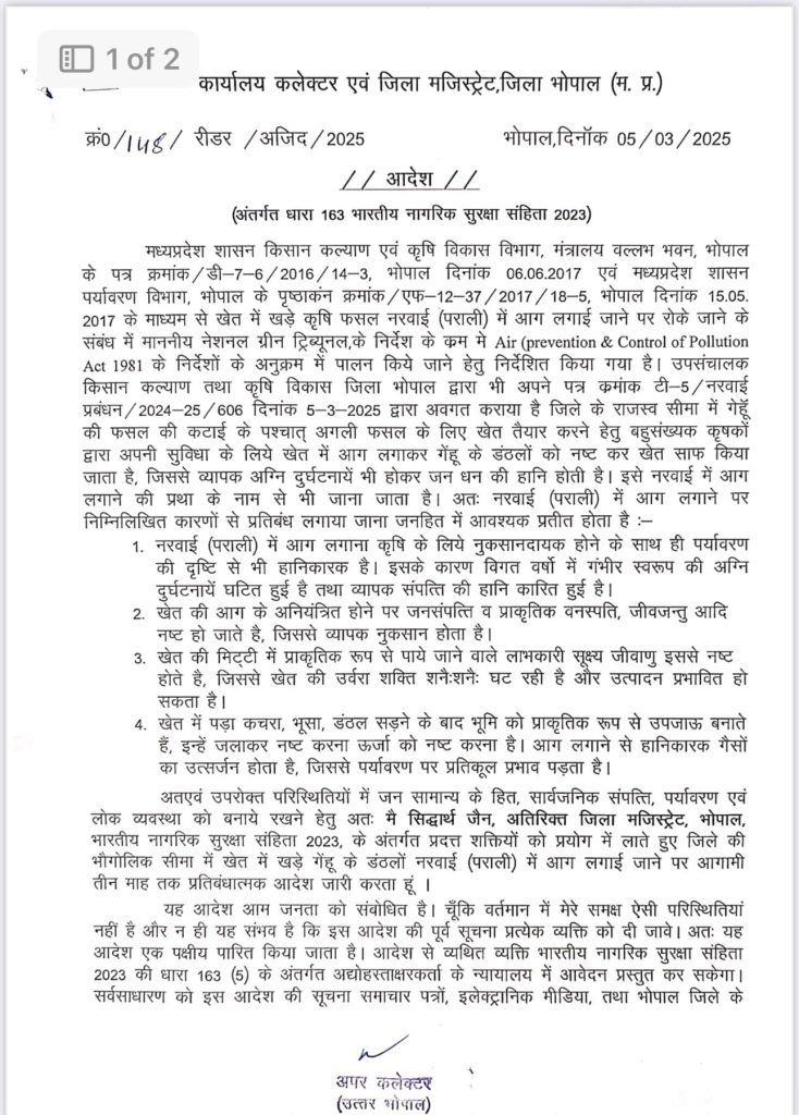 प्रदेश की राजधानी भोपाल में अगले 3 महीने तक पराली जलाने पर बैन लगाया गया है। बैरसिया, फंदा और भोपाल नगर के सभी क्षेत्रों के लिए निर्देश जारी हुए है। यह आदेश तत्काल प्रभाव से प्रभावशील होगा। इस आदेश का उल्लंघन करने वाले व्यक्ति के खिलाफ भारतीय नागरिक सुरक्षा संहिता के अंतर्गत कार्रवाई की जाएगी। वहीं संबंधित क्षेत्र के कार्यपालिक मजिस्ट्रेट और पुलिस थाना प्रभारी को क्षेत्र का भ्रमण कर व्यवस्था सुनिश्चित करने के निर्देश भी दिए गए है।